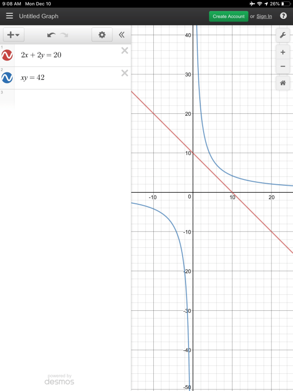 We also saw that sometimes there are no roots. In this case on desmos we can see that there are no intersection points between our two equations, so we have no possible dimensions that will work. It corresponds to the fact that the discriminant found is a negative number.