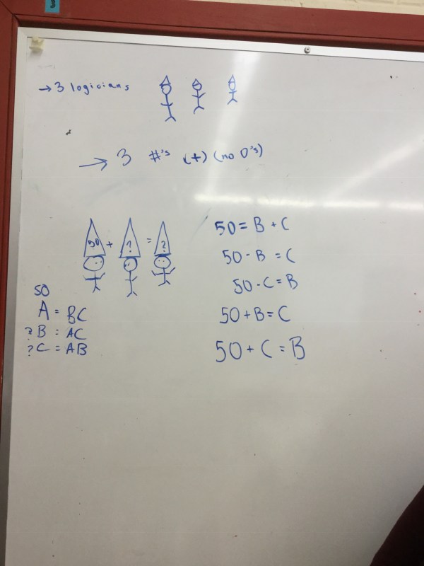 Our class today helped us get into the swing of things in a thinking classroom. We were in random groups, up at the board, tackling a challenging problem.