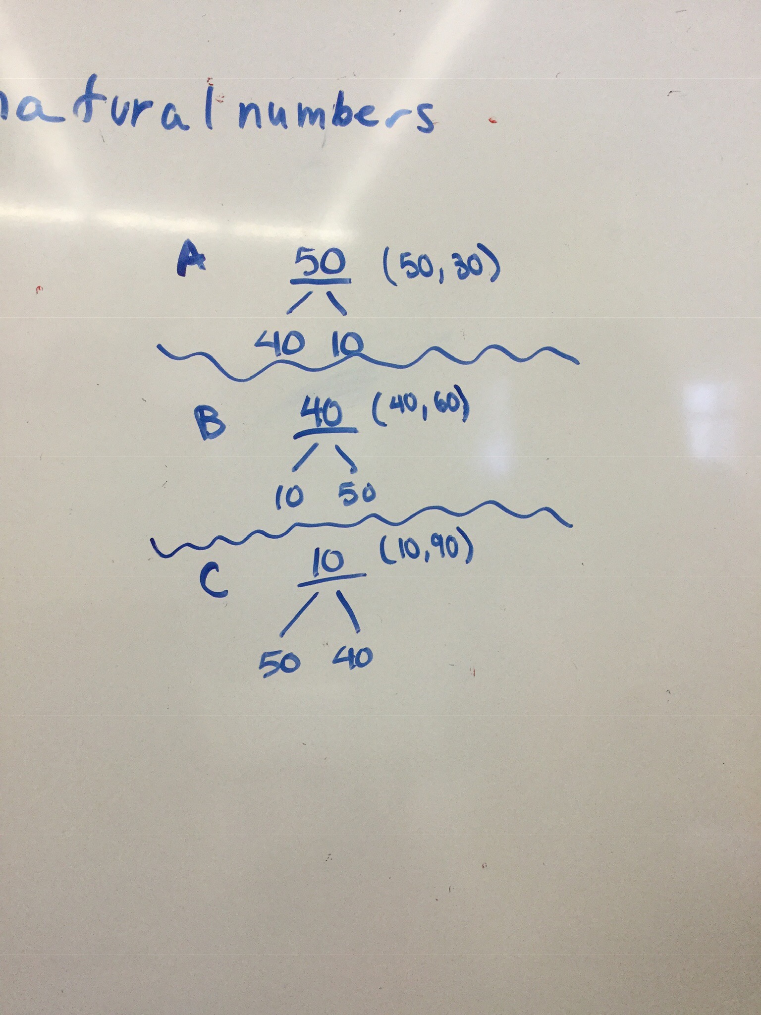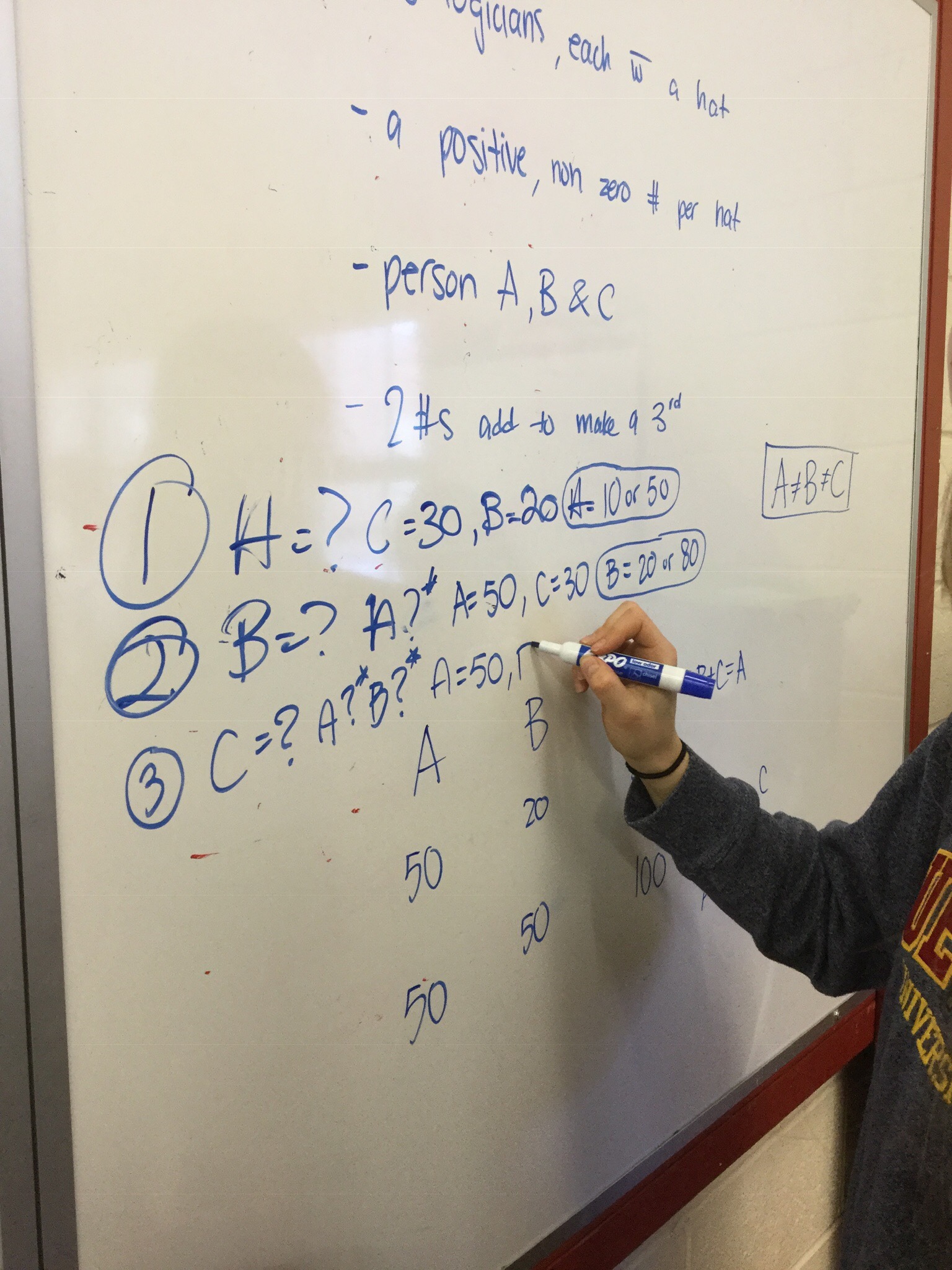 3 logicians (honest people with perfect logic) each have a hat. On each hat is a number. The numbers are positive (non zero) integers. 2 of the numbers add up to the 3rd, and each of the people know this. Person A looks at person B and C and says “I do not know my number”. Person B looks at person A and C and says “I do not know my number”. Person C looks at person A and B and says “I do not know my number”. After hearing this, person A says “I know my number is 50”. Our goal is to determine the numbers that B and C are wearing.