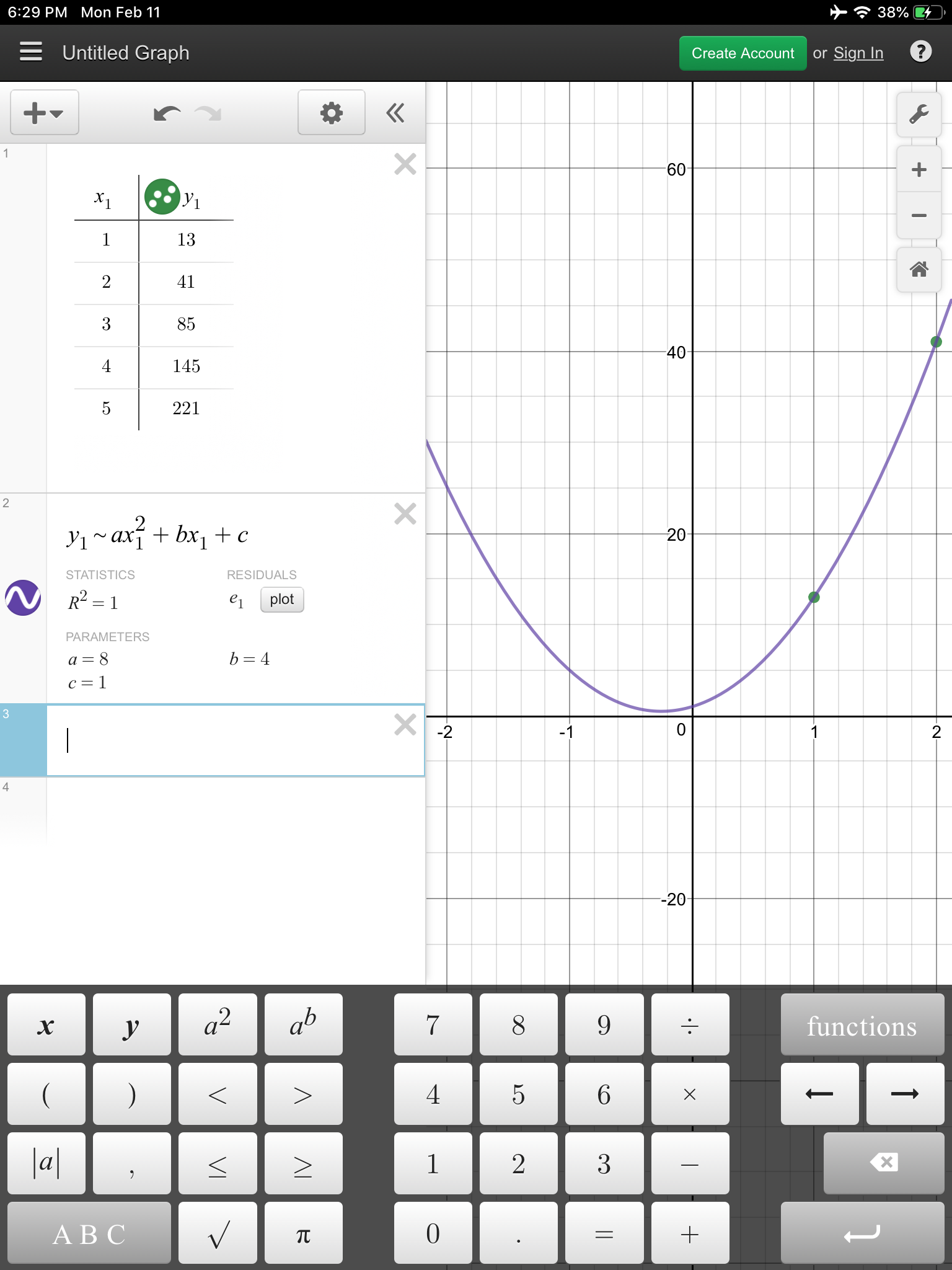 We looked at making a table on desmos and using regression to get an equation. We also explored what the vertex form would look like f(x)=8(x+0.25)^2+0.5, since the vertex is (-0.25,0.5).