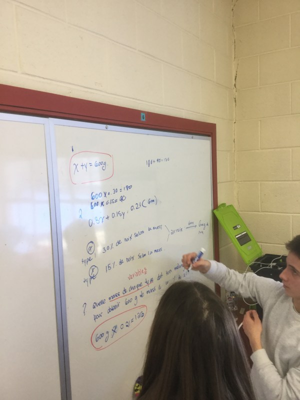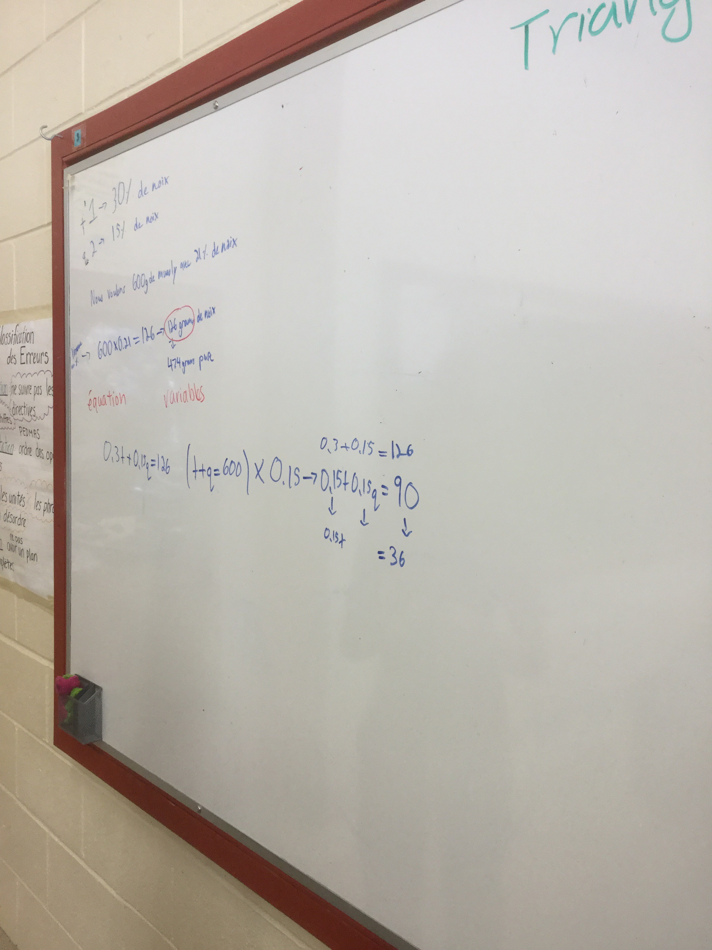 We looked at some complicated mixture problems today. For example, if you want to create a mixture of muesli that is 600 grams and 21% nuts, but all you have is two containers, one had muesli that has 30% nuts, the other has muesli that has 15% nuts. How much from each container do you need to create your ideal mixture?