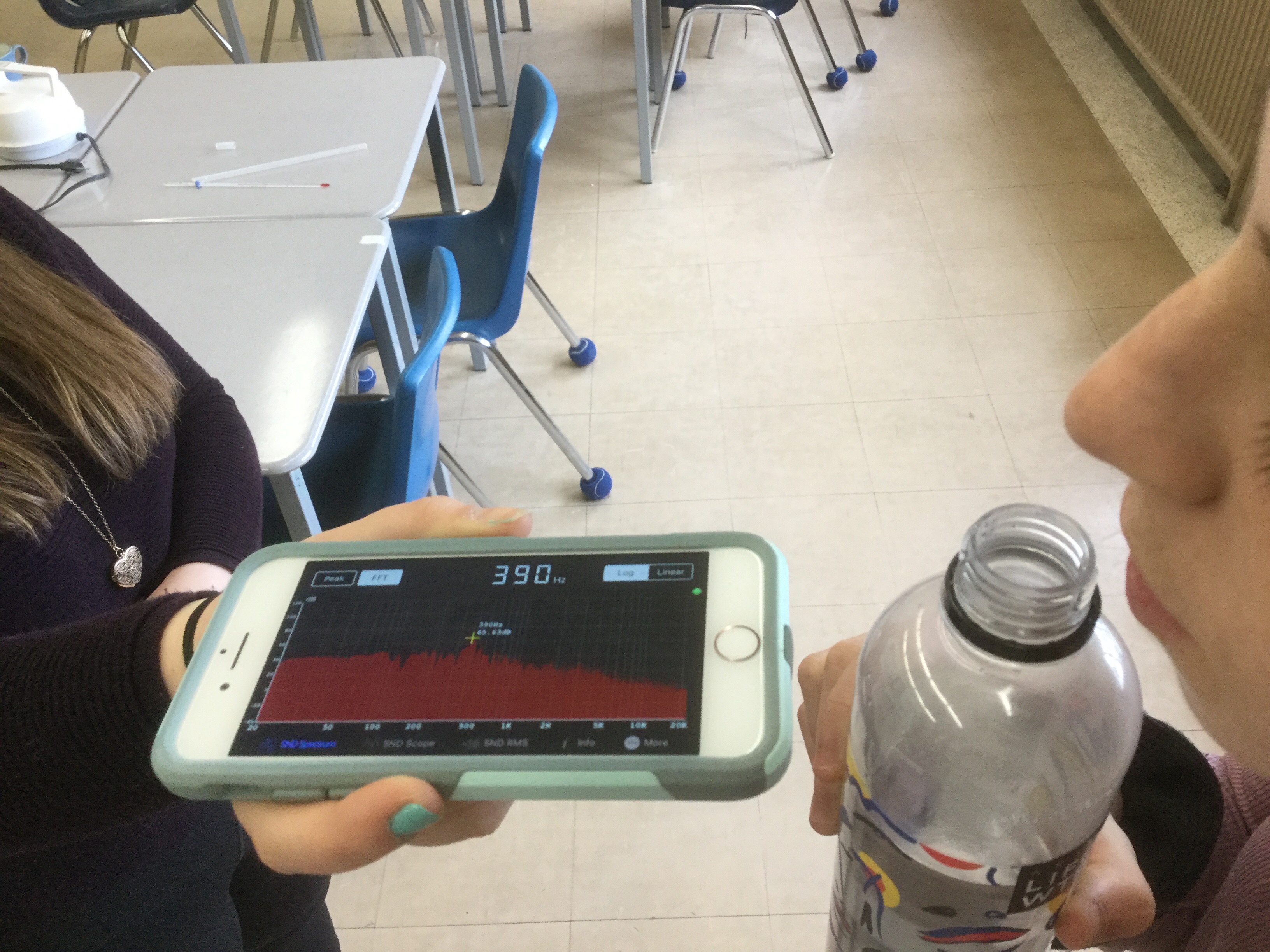 We used the app “sonic tools” to determine the frequency, and we started out with a lot of water in our bottles (which creates a small air column), and we decreased the level of water between trials, which increases the column of air in the bottle.
