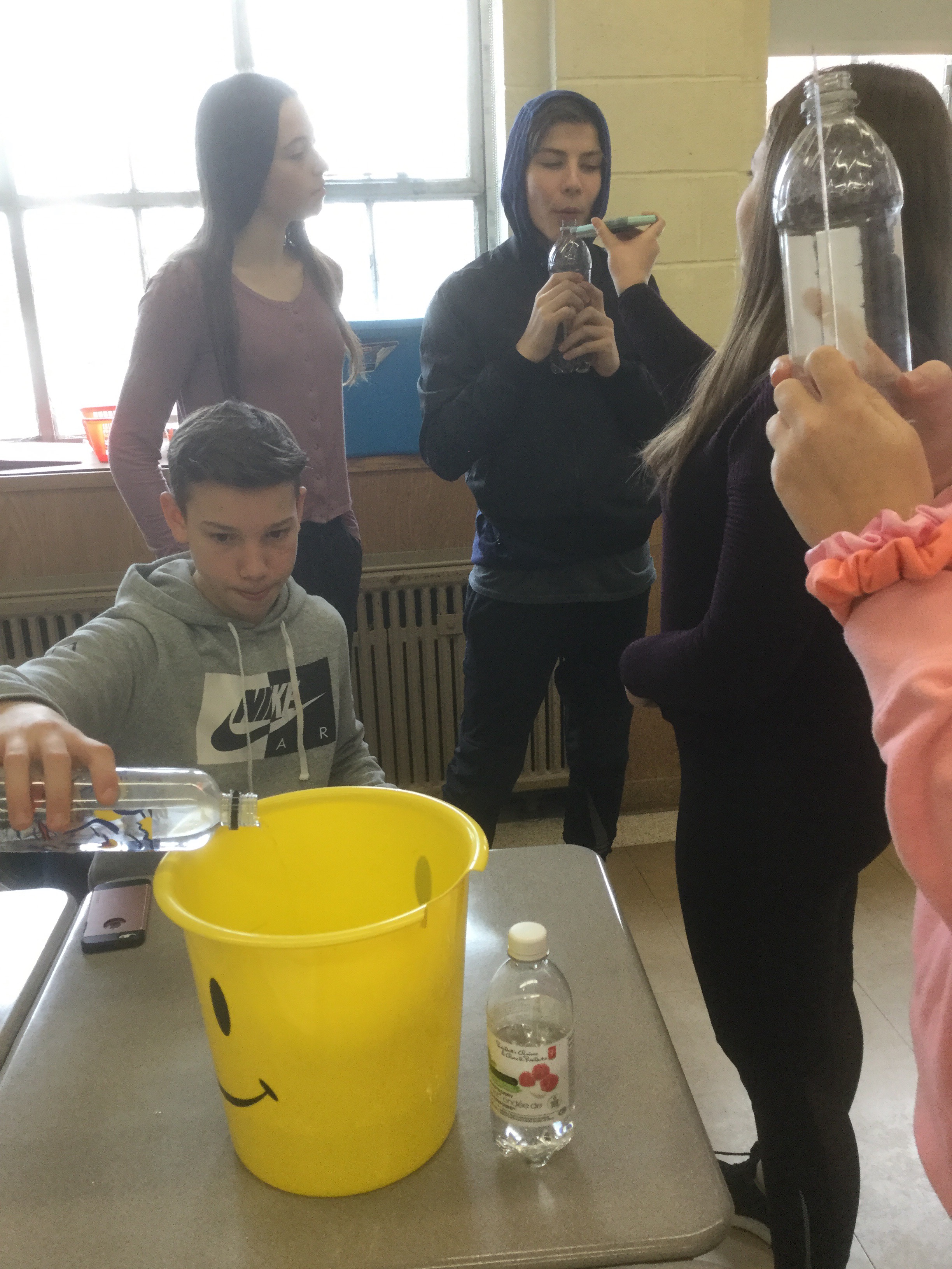 Today in grade 9 we experimented with the sound produced when blowing over the neck of a bottle with more or less water in it.