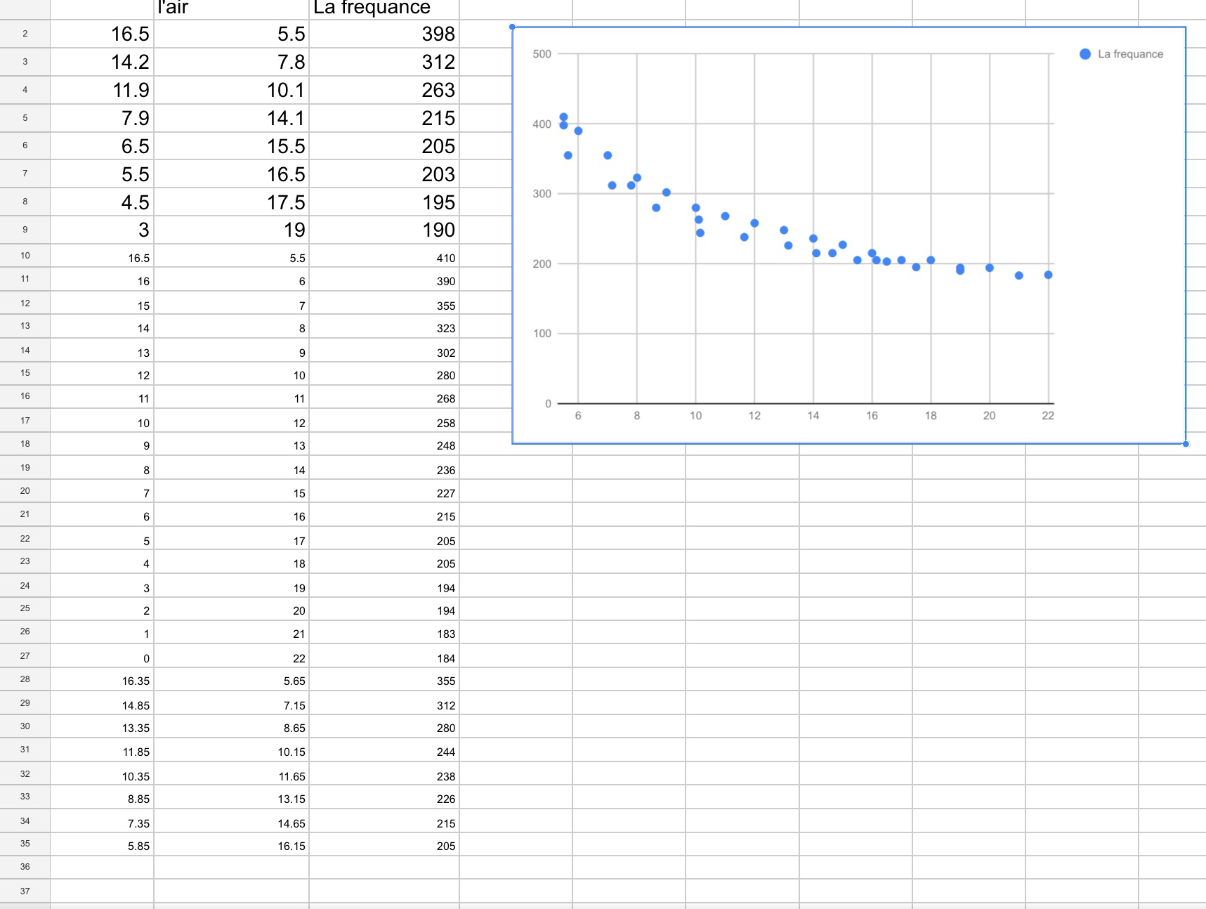 This graph has the frequency on the vertical axis, it is what we measured, and it depends on the height of the air column. The frequency is the dependent variable. The height of the air column is on the horizontal axis, it is the independent variable, which we modified as part of our experiment.