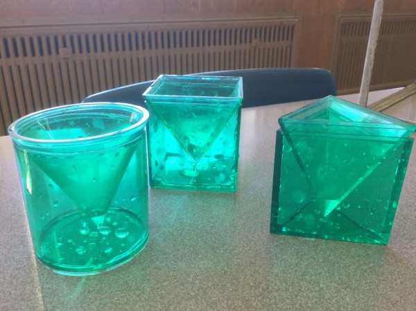 However minds changed quickly when the pyramid was poured once into the prism. After that we all agreed that it’d take 3 pyramids to equal the prism volume, or that the pyramid was 1/3 the volume of the prism.