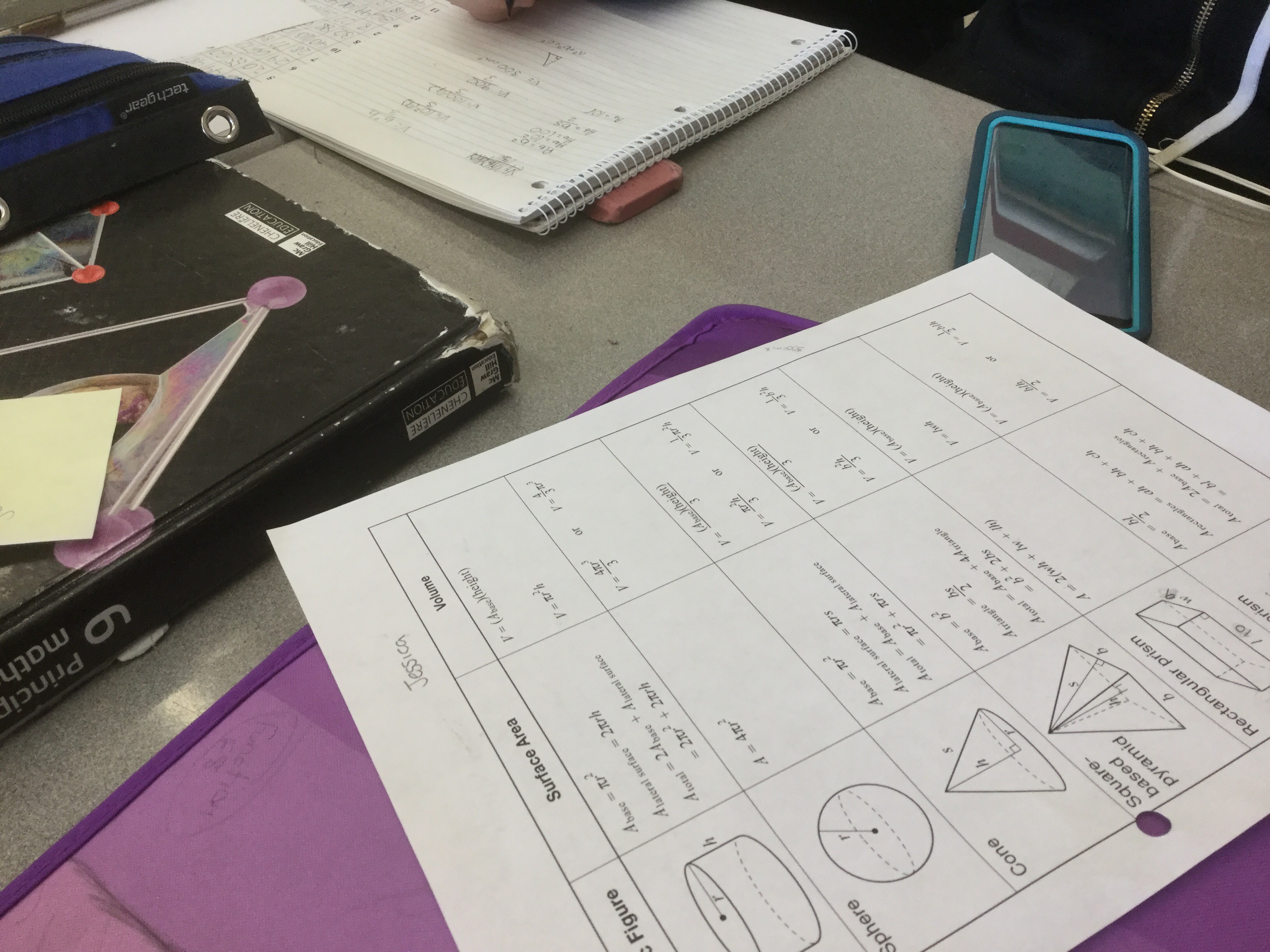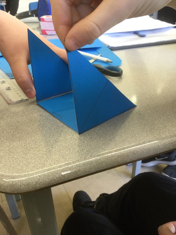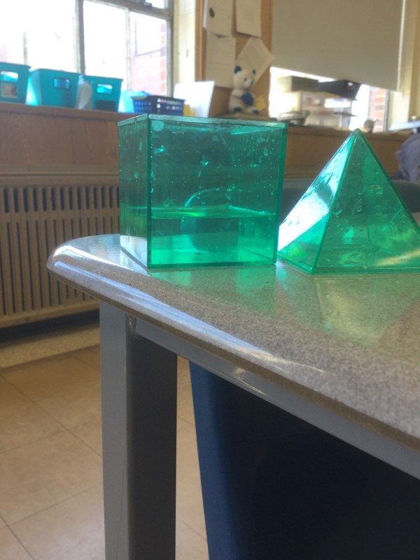 In grade 9 we looked at a variety of pyramids and their related prisms (same base and height). We estimated the number of times the pyramid could be filled with water and emptied into the prism to fill it up. Guesses ranged from 1.75 times to 3.5 times, with most of the class finally settling around the guess of 2 times.