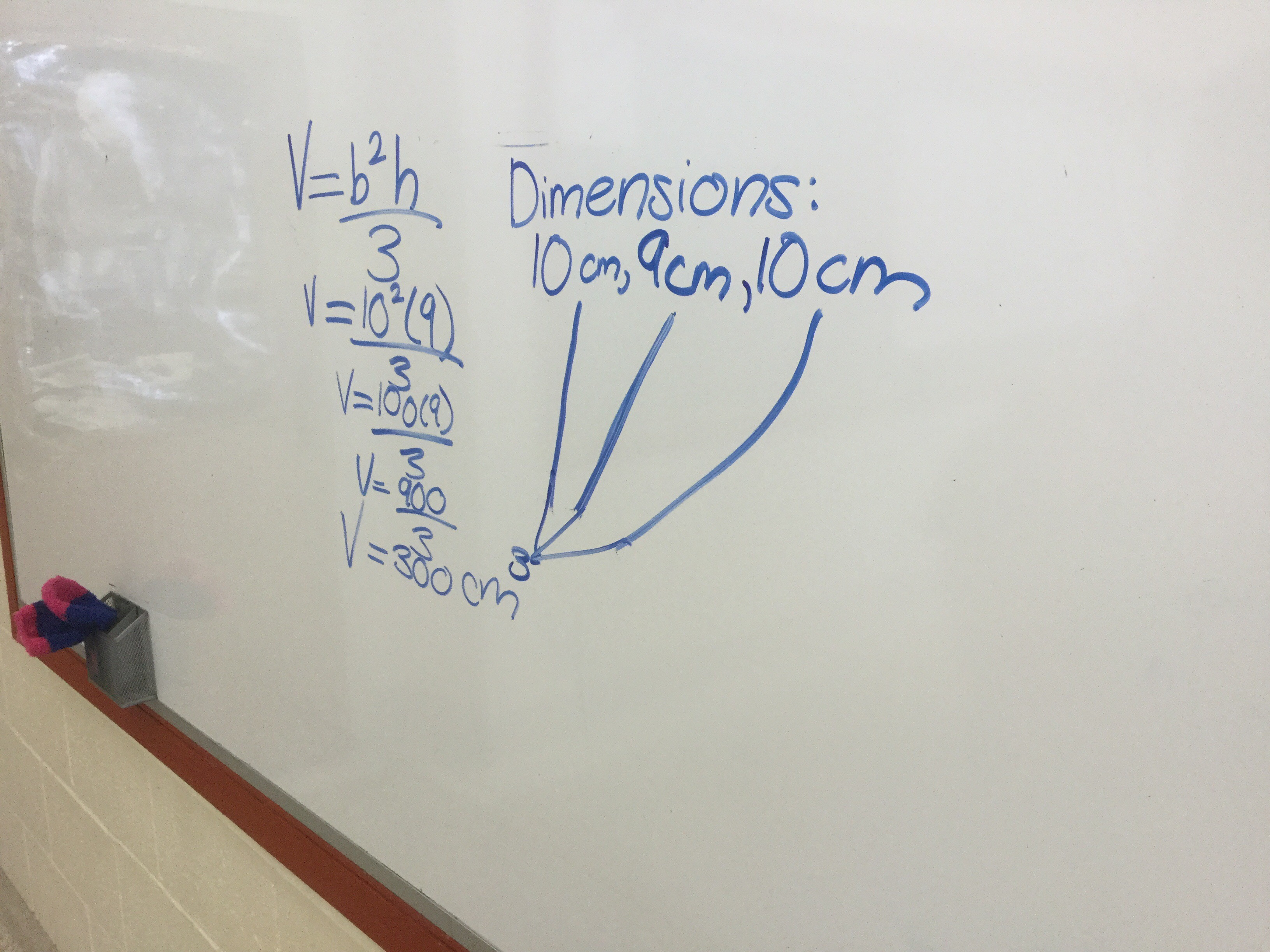 We set about to build a pyramid with the volume of 300cubic centimeters. We needed to do some calculations, and figure out what dimensions would work. Many groups figured out dimensions of a prism that has a volume of 900 cubic centimetres to start with.