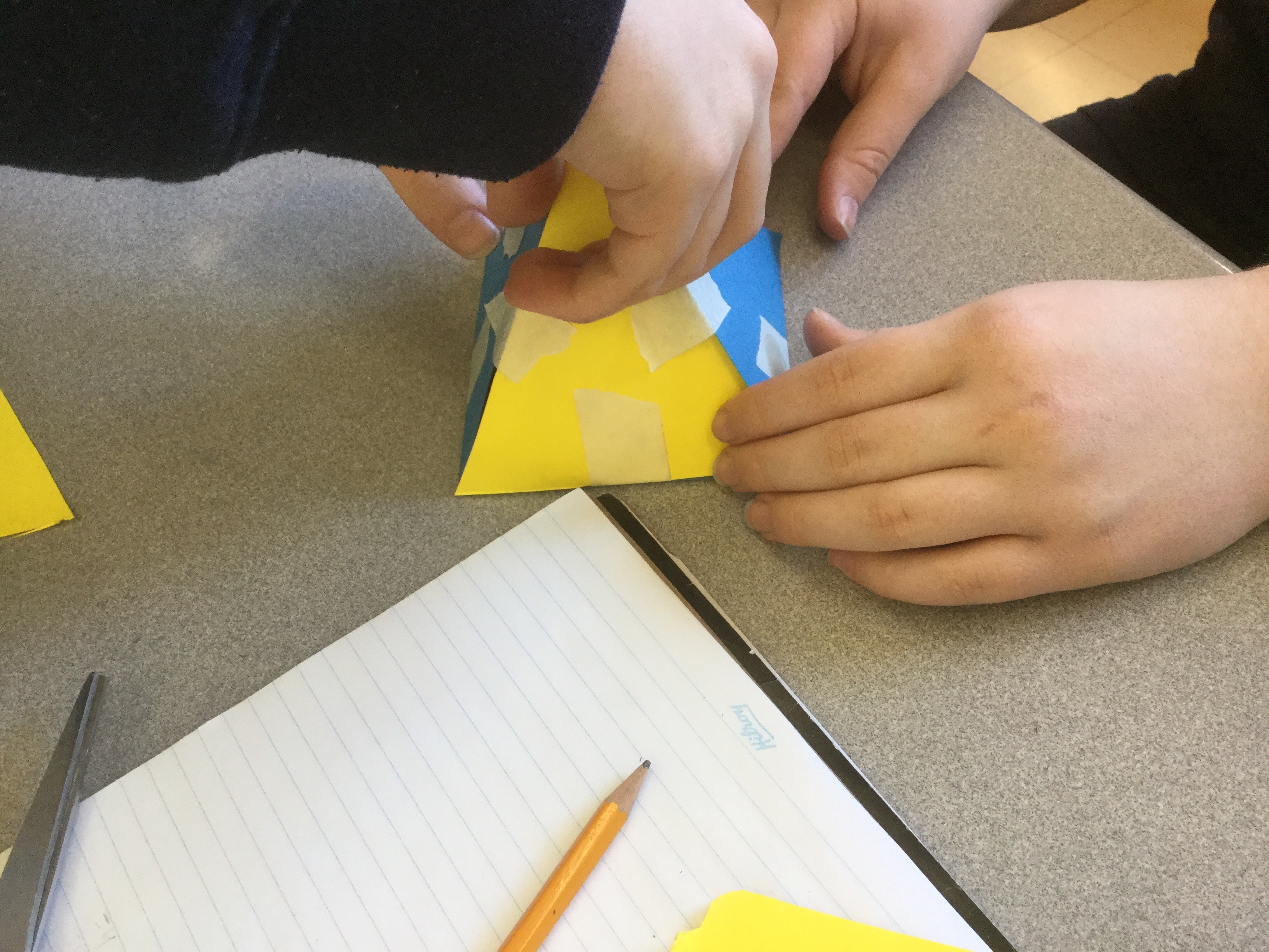 Many groups had to start over, because for many their pyramids were too short. Many built pyramids hoping for the height to be 9, but instead they measured the height of the sloped triangle sides to be 9, so the entire pyramid height would be smaller than that.