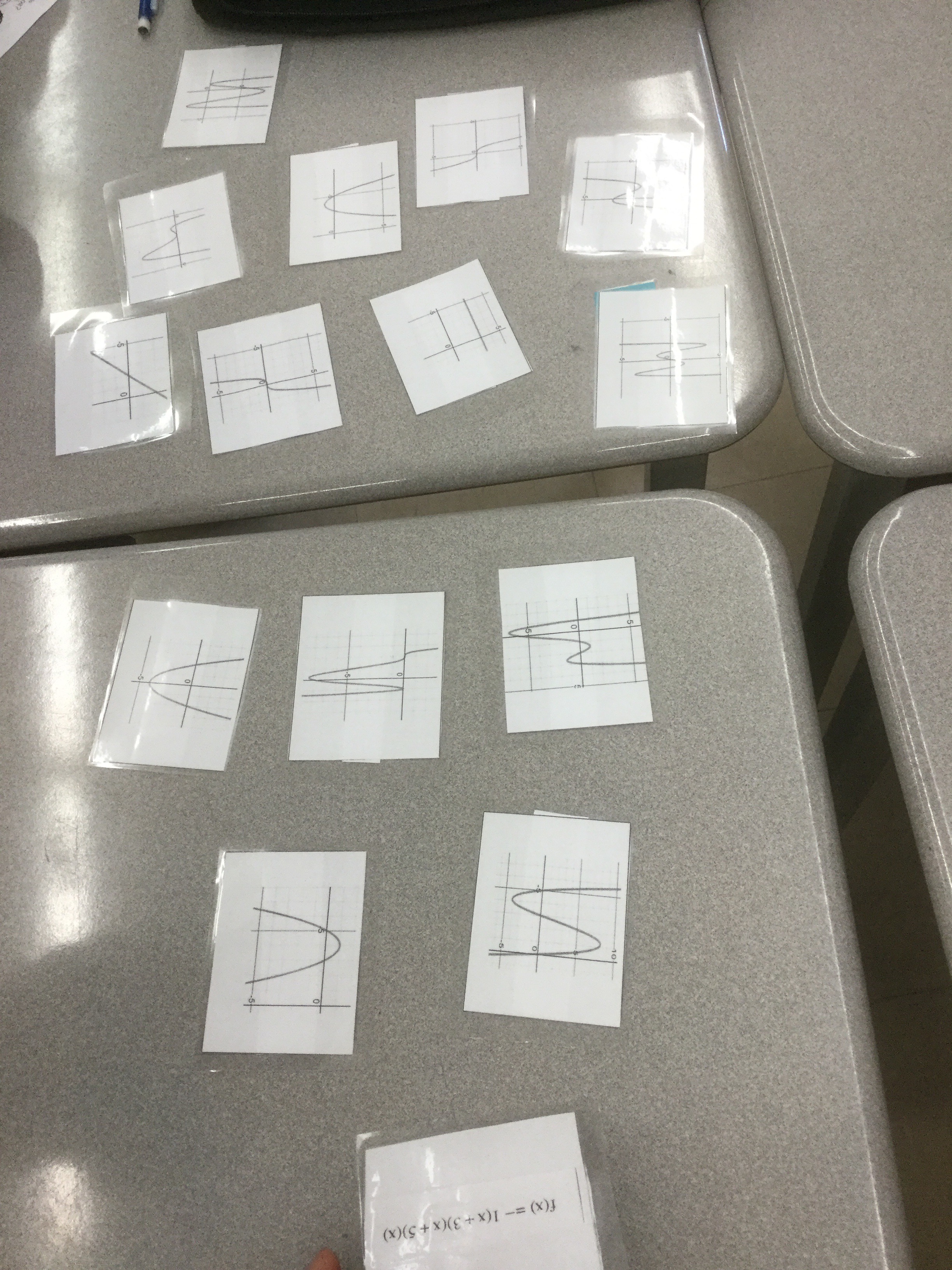 We did a card stack review activity. Each card has an equation on one side and a graph on the other. The card are all placed graph side up, one card is flipped, and then we need to find the graph that matches the revealed equation. When the graph that matches is found, it is flipped onto the pile to reveal a new equation. This continues until the pile is complete. The equation at the top will match the graph on the bottom of the pile.