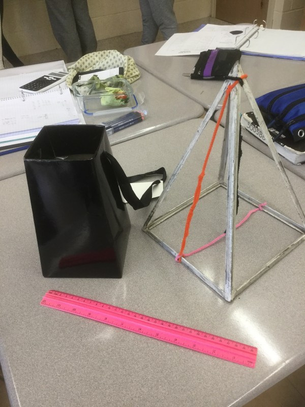 We noticed that it was going to be hard to figure out the height of the pyramid. The ribbon attached turned out to be a very lucky length!