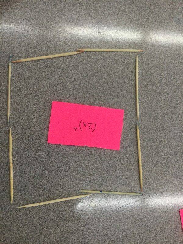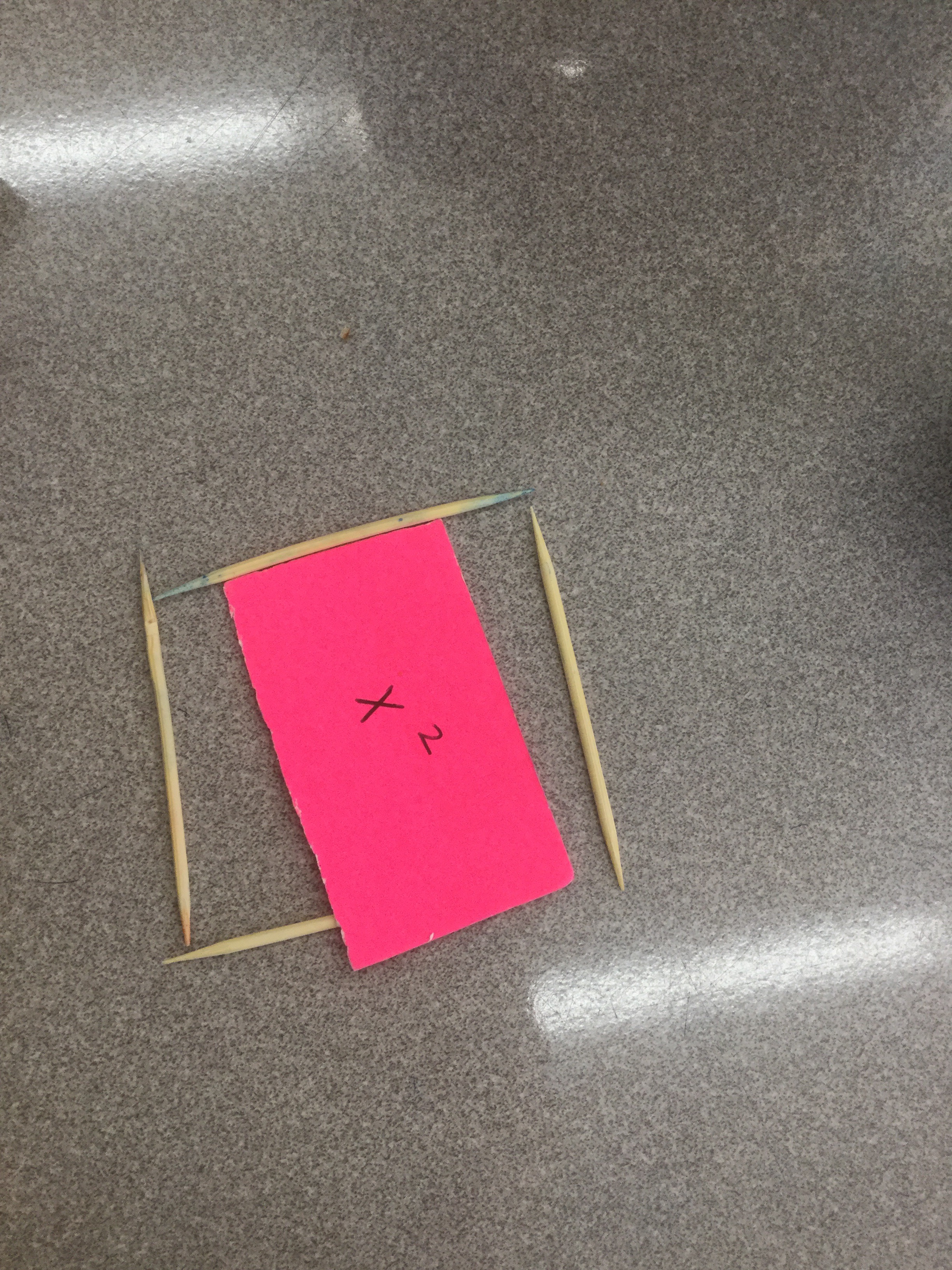 For example, we’ll call one tooth pick x, then this is x squared. The exponent tells us it will be 2 dimensional, and the base of the exponent is x, so that’s the dimension of the square.