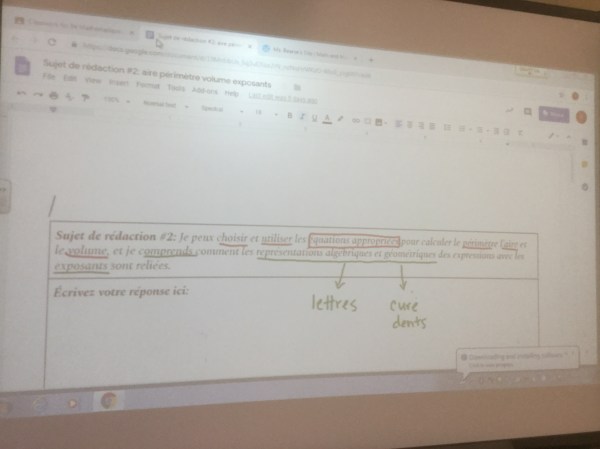 Grade 9s are working on portfolio submission #2 all about surface area, perimeter, and volume, and understanding the connection between the algebraic and geometric view of exponents. We looked today at the important parts of their prompt, and how to be sure all parts get answered in their writing.