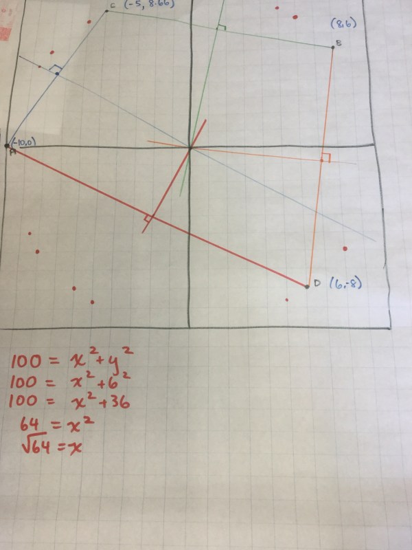 We looked at where to locate the sprinkler head if we wanted to water plants that are at A B C and D. We used the intersection of the perpendicular bisectors to find the point equidistant to all 4 points.