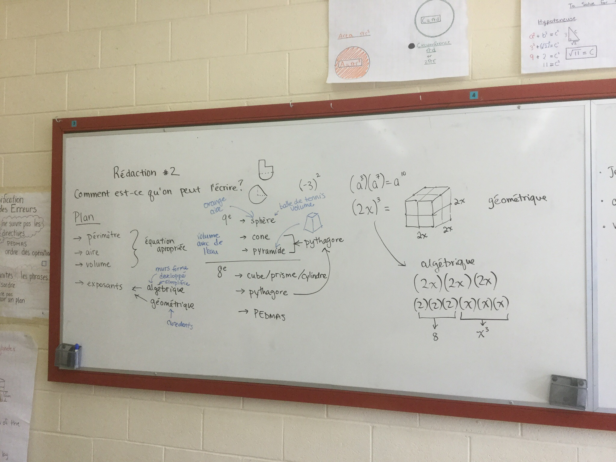 We looked today at how to create an organized piece of writing that addresses all areas ur portfolio prompt. We need to discuss how we can choose and use appropriate formulae for calculating perimeter, area and volume, and also how to connect the algebra and geometric representation of expressions with exponents.