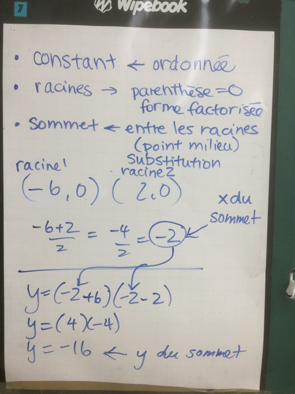 Today in grade 10 we looked at a parabola on a graph. We graphed the standard form, and the factored form, and looked for interesting points and how the values in the equation relate to the values on the graph.