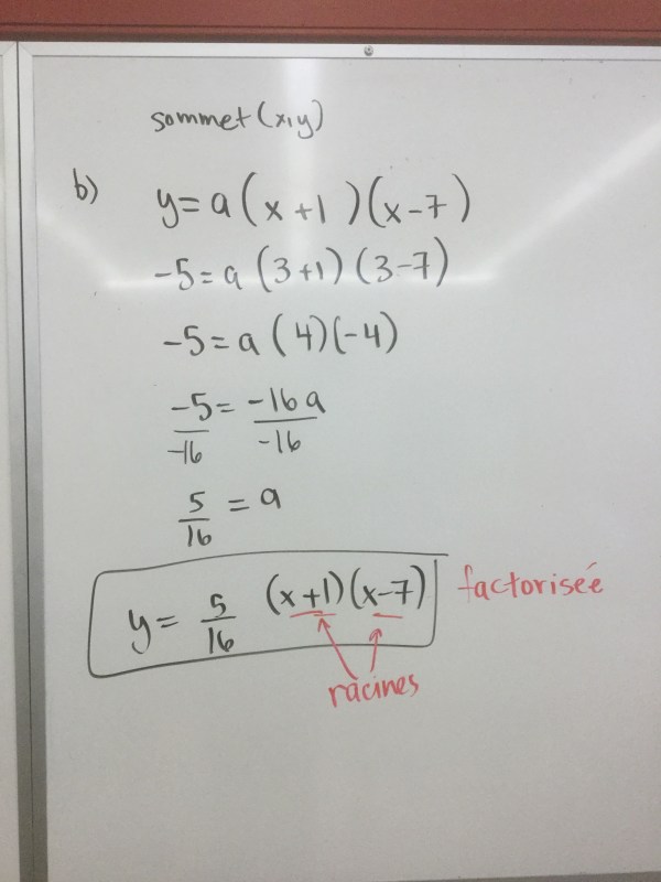 The next form was factored form, so we needed both zeros and a point (the vertex) and we subbed in our values and calculated “a” (which was the same as before! We noticed “a” is the same in all forms).