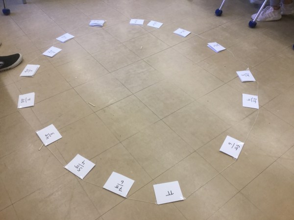 grade 12s are developing their comfort with radian measure. Today we made a proportional clothesline of radians. We taped all the cards to the string, and then made the string into a circle to check our work.