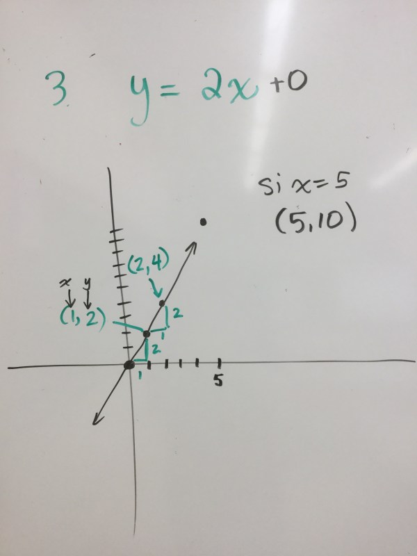 we looked at lots of lines today, some were direct, like this one with a constant of 0, we noticed the rate triangle which shows that the line goes up by 2 for every one it goes over. We also looked at how each point has coordinates that satisfy the equation, so if x=5, y=(2)(5)=10