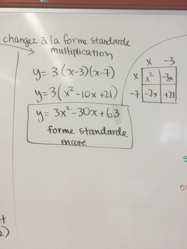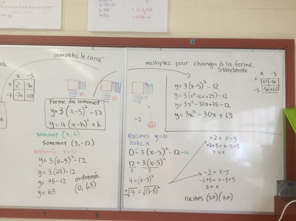 Some quadratics work nicely in all forms. Here’s an example of one that can be factored, and also one that we can complete the square of, with no decimals. This is not always the case. Some cannot be factored, some have no roots. Some have a vertex (sommet) that has decimals. We can always complete the square, but it can be a lot messier than in this case.
