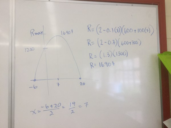 Grade 10s are working on quadratic word problems. We’re looking at maximum areas for fields, and maximum revenue for bushels of potatoes. In any situation we need to first identify variables, make an equation, or two, with the goal to make something quadratic. We are looking here for the maximum area or revenue, so we want to find the vertex (sommet) so we need to remember all the ways to do that, and hopefully choose a way that is quick. It’s often easy to find the zeros, the midpoint, and then the vertex.
