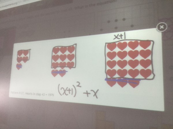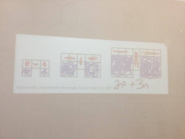 we’re practicing how to make equations from visual patterns in grade 10. We are using colours to show different terms. In this we have 2 n by n squares, and 3 groups of n in each figure. We see figure 1,2,3 shown.