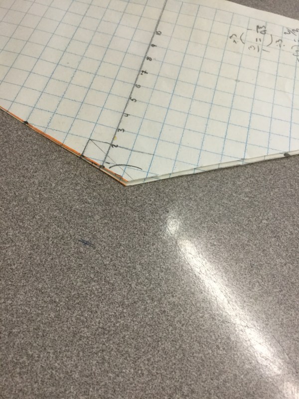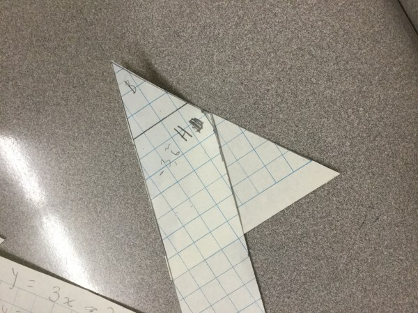 Next we drew a line through 2 given points (-5,8) and (3,-6). We calculated the slope, and the y intercept and then graphed the lines. Our last step was to label the angles and cut along the parallel lines and the transversal.