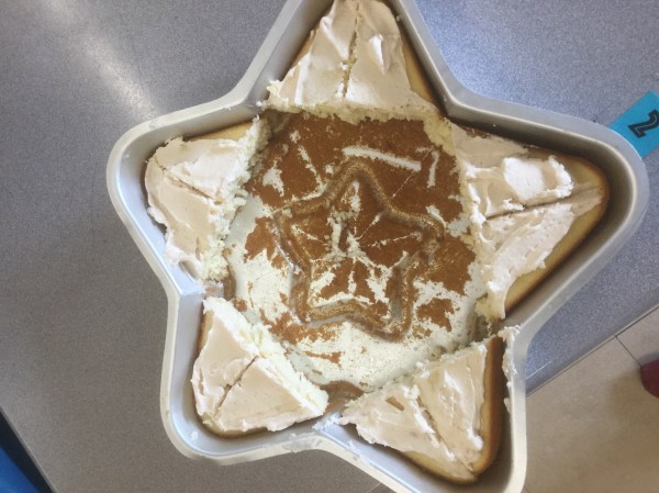 The cake is in a star shaped pan, and we want to cut it into 20 equal pieces.