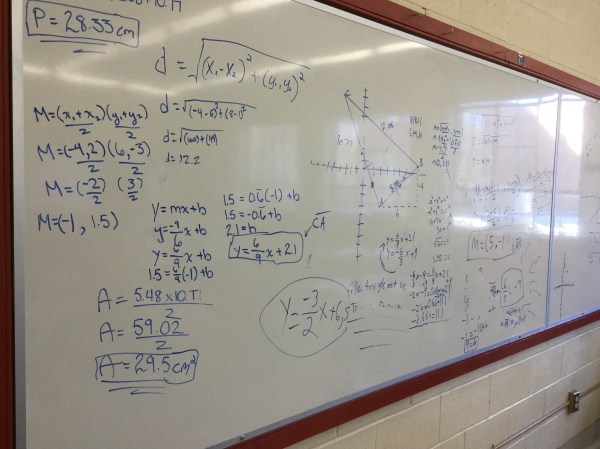 Grade 10s worked hard today solving a series of problems about a triangle. Given only the 3 coordinates of the points of the triangle we classified it (determined it was a scalene right angle triangle). We used side lengths and slopes to help us with that task.