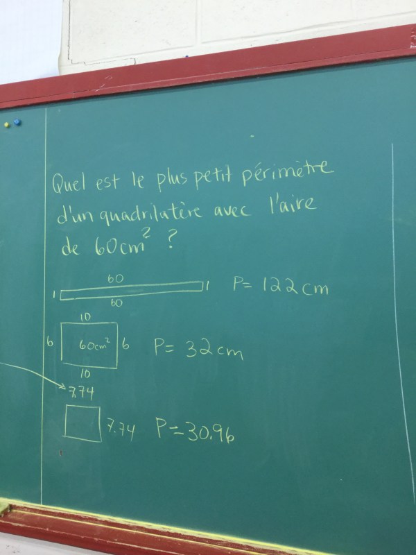 Grade 9s looked at rectangles with a perimeter of 24 today. We learned that there are many ways to make a rectangle with perimeter 24, and that they don’t all have the same area.