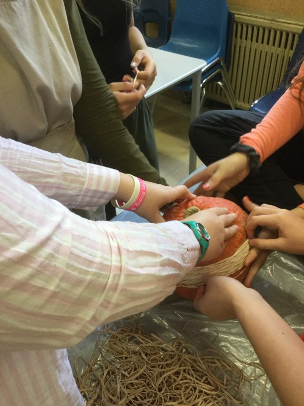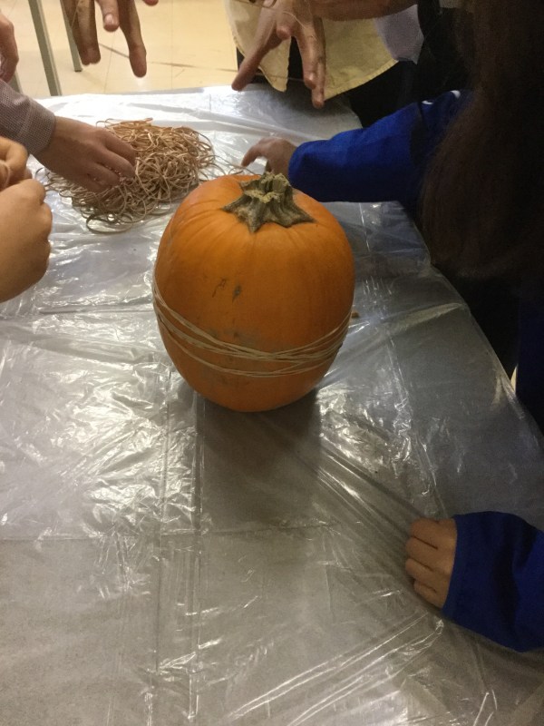 We measured heights, circumferences, and then made a prediction about how many elastics it’d take to pop the pumpkin open.