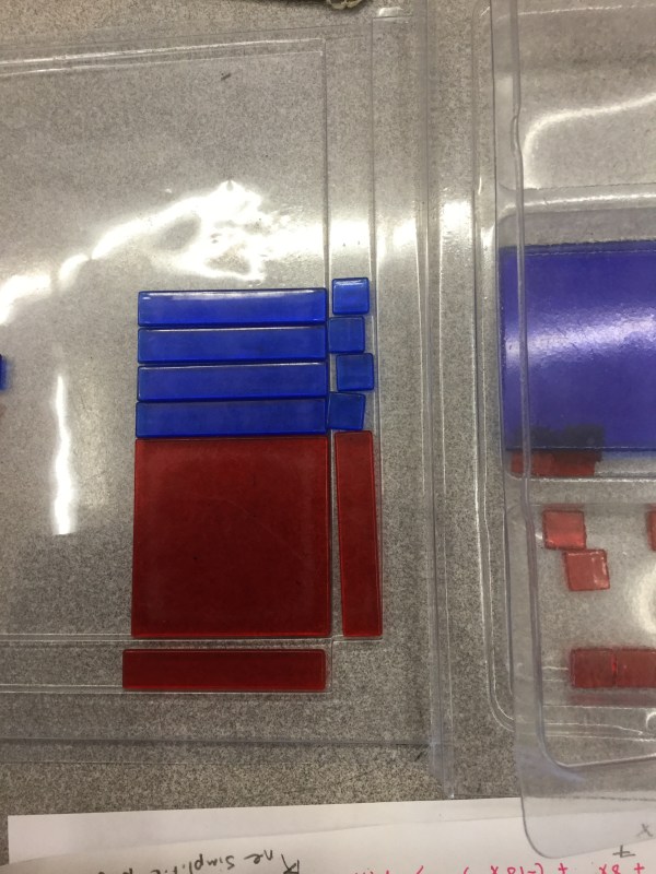 Grade 9s are multiplying with algebra tiles now! This photo shows (x)(x-4) and the answer to that multiplication is x^2-4x.
