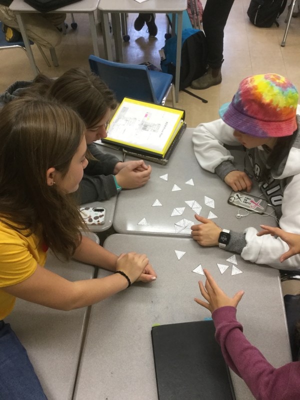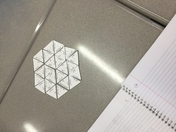 Grade 9s worked on exponent laws and algebra practice today by putting together tarsia puzzles.