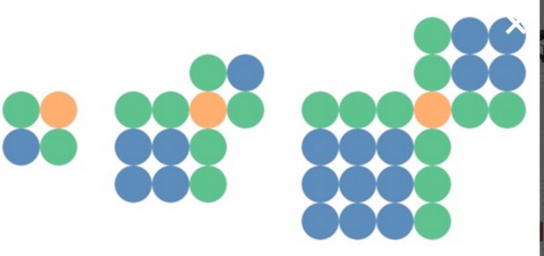 Figures 0,1,2,3,4 are shown. We looked at representing each colour with an equation, or modelling the growth of the entire set of circles.