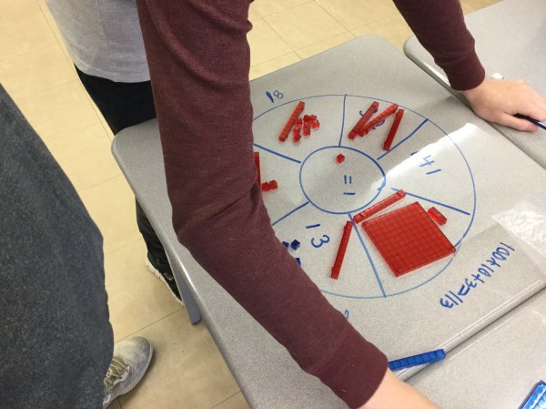 We used a concept circle to show our understanding. The center of the circle defines “one”, and then we used that to build larger numbers out of the base 10 blocks. Sometimes the base 10 blocks were given, and we needed to write the number.