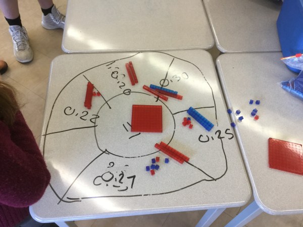 We built models to correspond to the values in our concept circle. This concept circle has a 100 block as equal to 1. That means that each single block is equal to 1/100 or 0.01