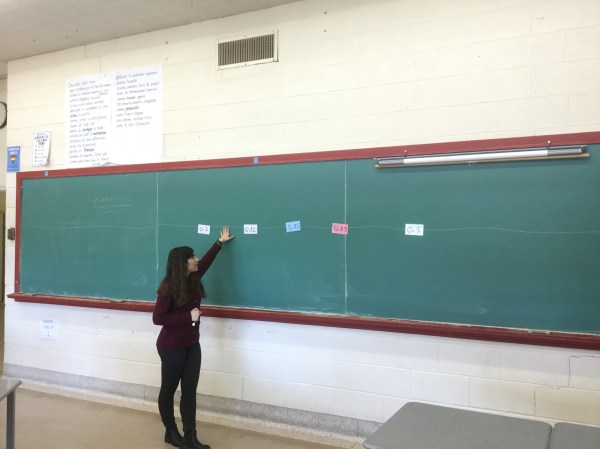 We are working on placing decimal numbers on a number line, including tenths and hundredths.