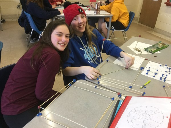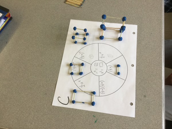 Grade 9s are working hard to represent expressions with exponents using toothpicks and skewers. We call the toothpicks x and the skewers y. We can build shapes with volumes like (x)(y)^2 and (y)(x)^2 now and we know how they are different. We can represent the surface areas also, since we know that each side is a rectangle, and the area of each rectangle is length times width.