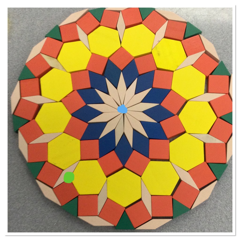 We got out the polygon tiles today in MTH1W and made some beautiful art. We can use our art to talk about a lot of math topics. In this image for instance, we can explore fractions, and see how we can use several different types of tiles to create hexagons. Each hexagon is made of 6 green triangles, or 3 blue rhombuses, or 2 red trapezoids.