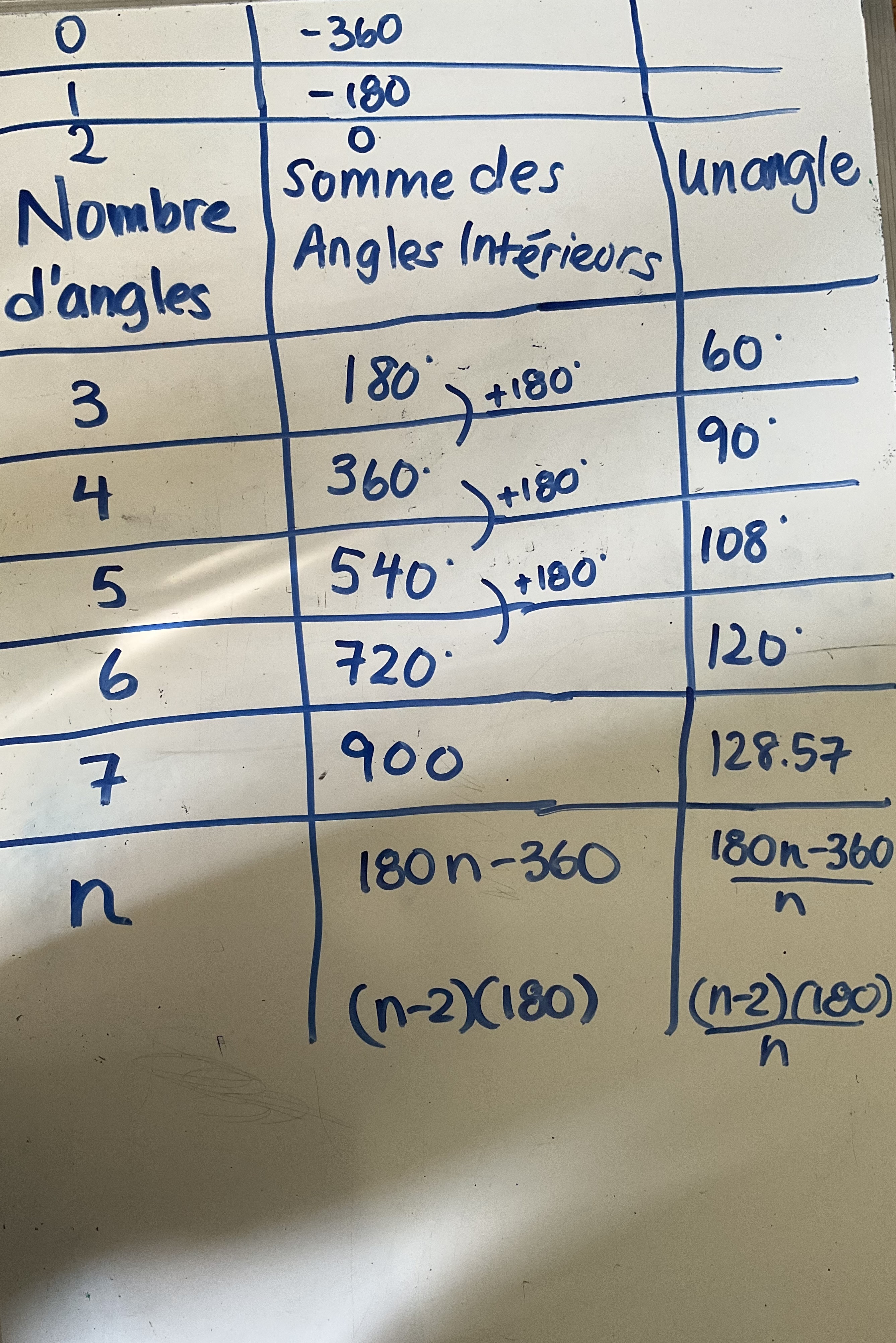 We got interested in figuring out what the interior angles of polygons were, and we built a table of values to check for patterns.