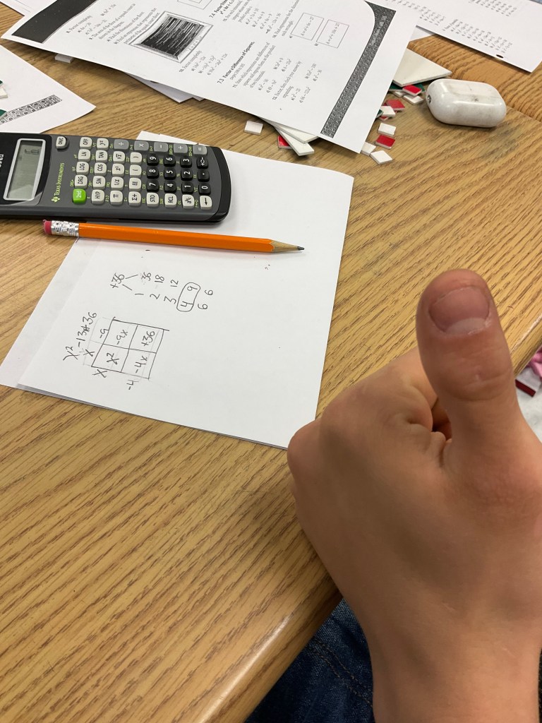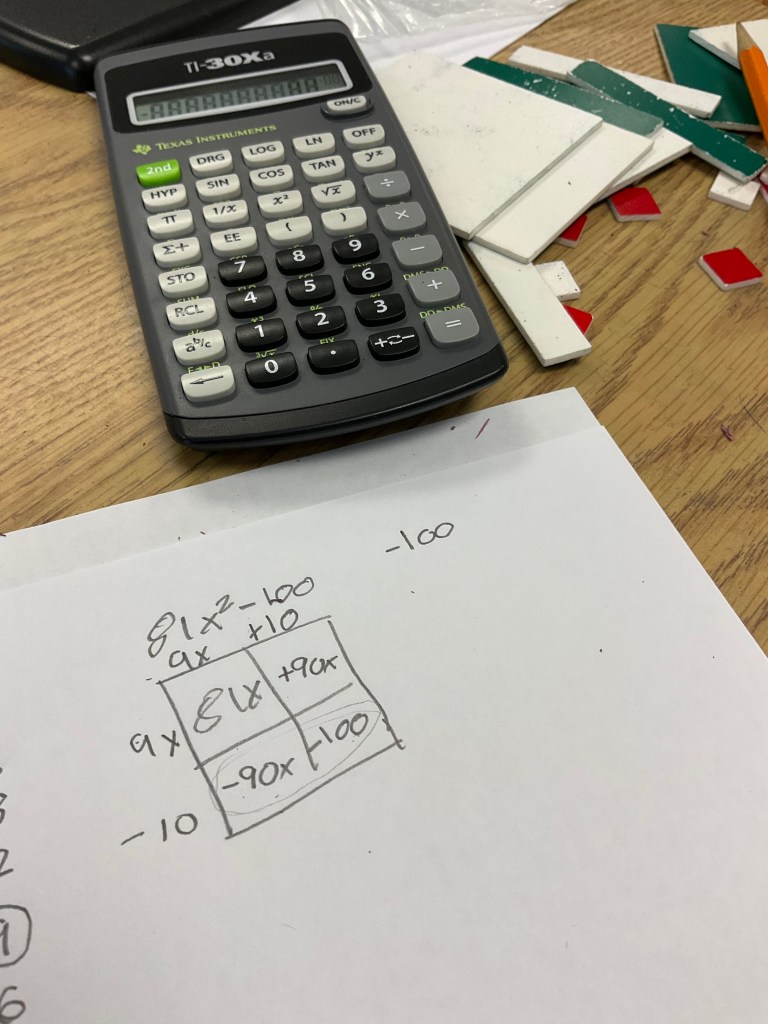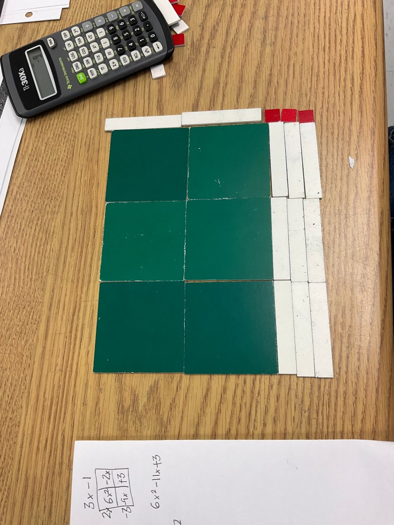 I’ve been helping out in a grade 10 applied math class during my prep time this month. One of the students I’ve been working with has become a master of algebra tiles for expanding and factoring quadratics.