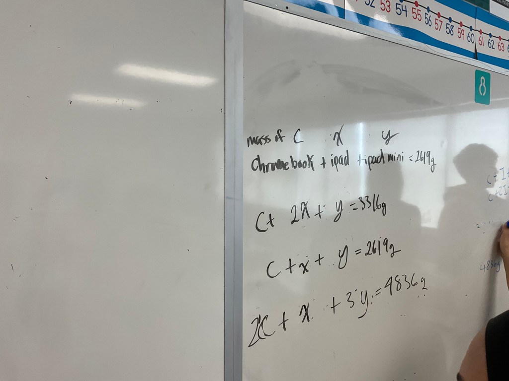 Act 2 brings more information, often at the request of students. They know that the first video didn’t have enough information in it, so the next videos provide more details that can be used to calculate something. In this case, it is the mass of an iPad, a Chromebook and an iPad mini.