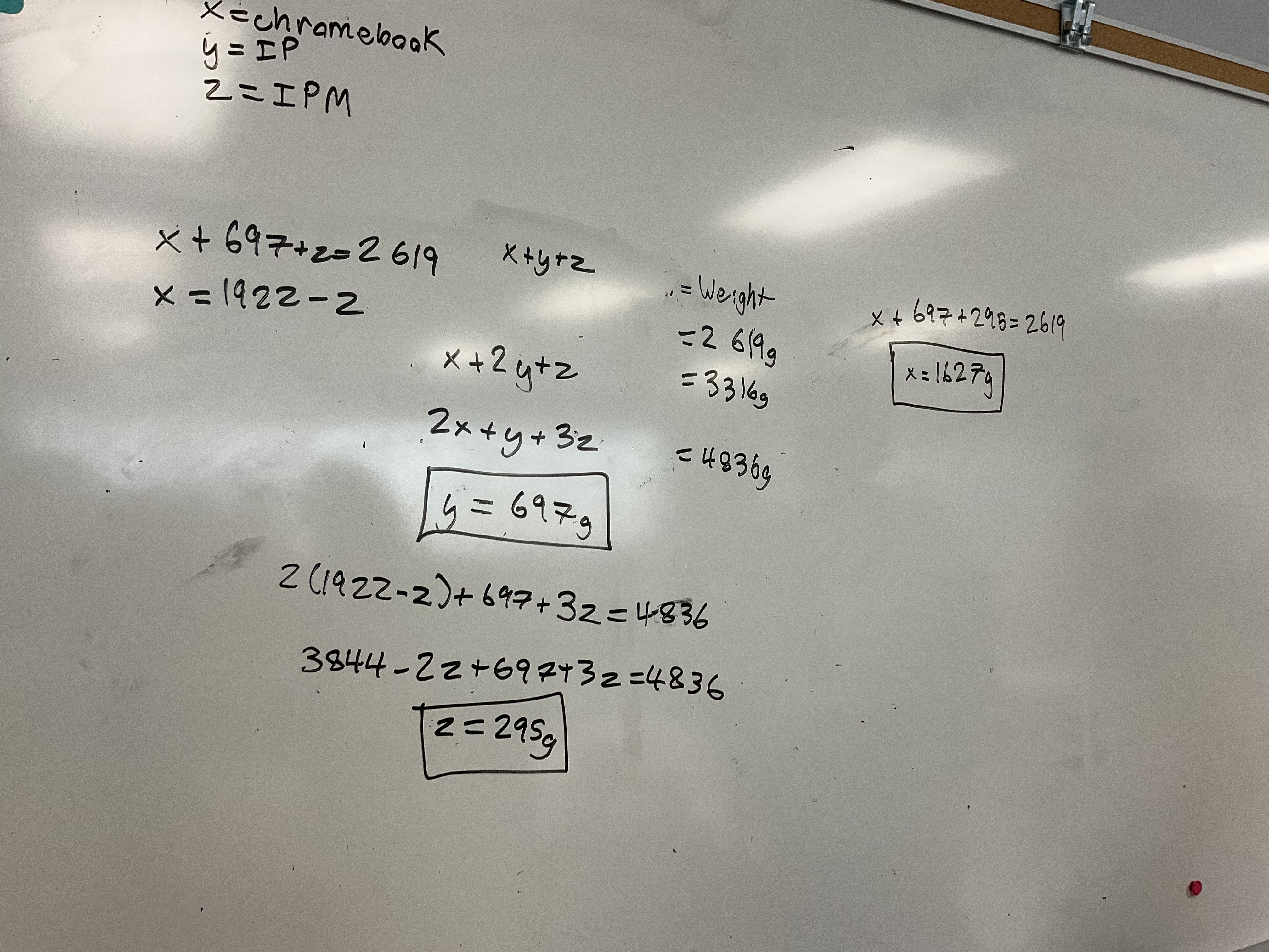 Some groups went directly to elimination. This is a great task to use as an intro to elimination as the equations seem to invite that solution method, and students intuitively take that path.