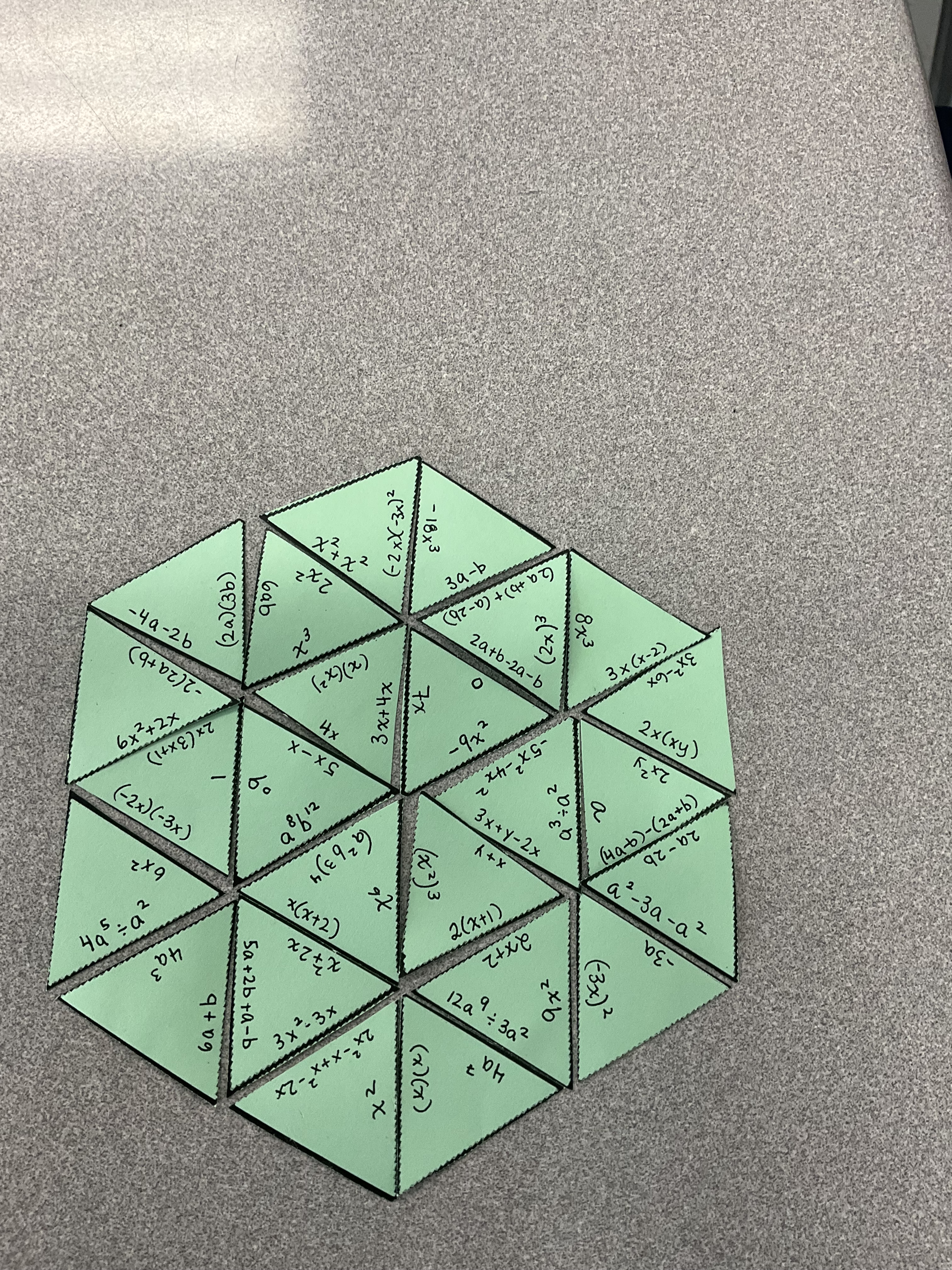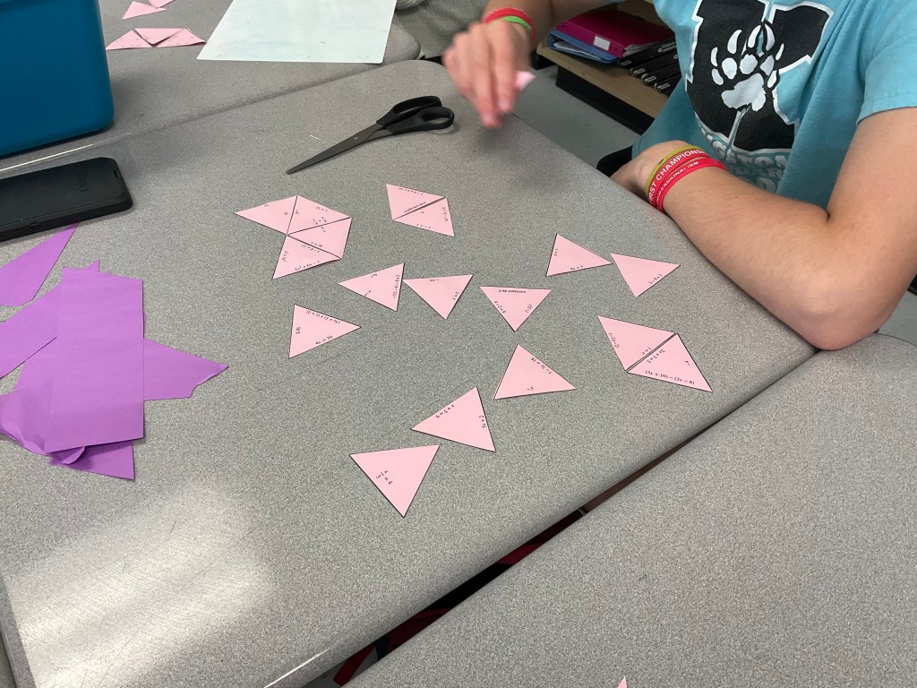 Grade 9s are deep into algebra review today. We dug out some math Tarsia Puzzles and had some fun putting them together.