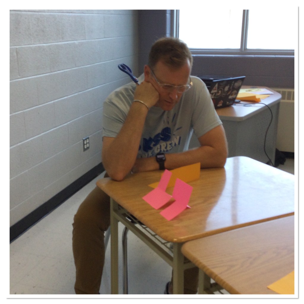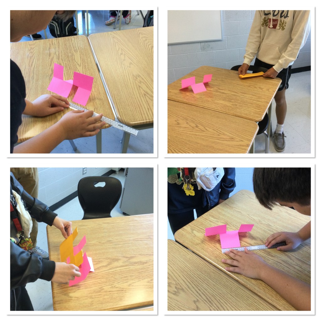 The goal was to use a half piece of paper to recreate this shape. Students couldn’t touch the pink page, but could come up and examine it. Some brought rulers and took detailed notes.