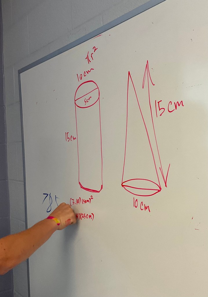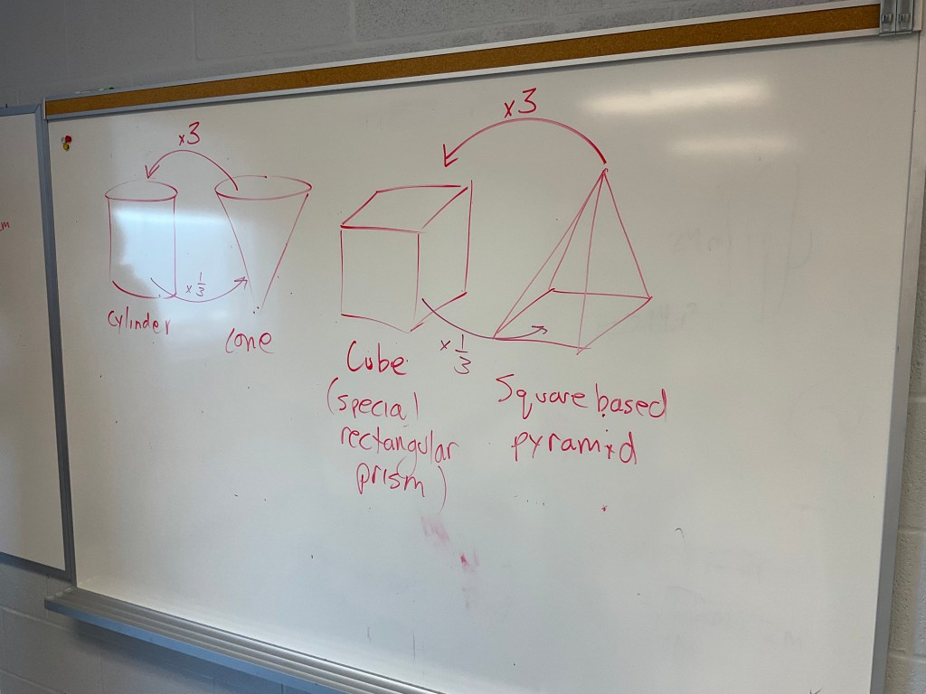 From there, students were up at the boards in small groups working on calculating the volume of pyramids and cones, and cylinders and prisms.