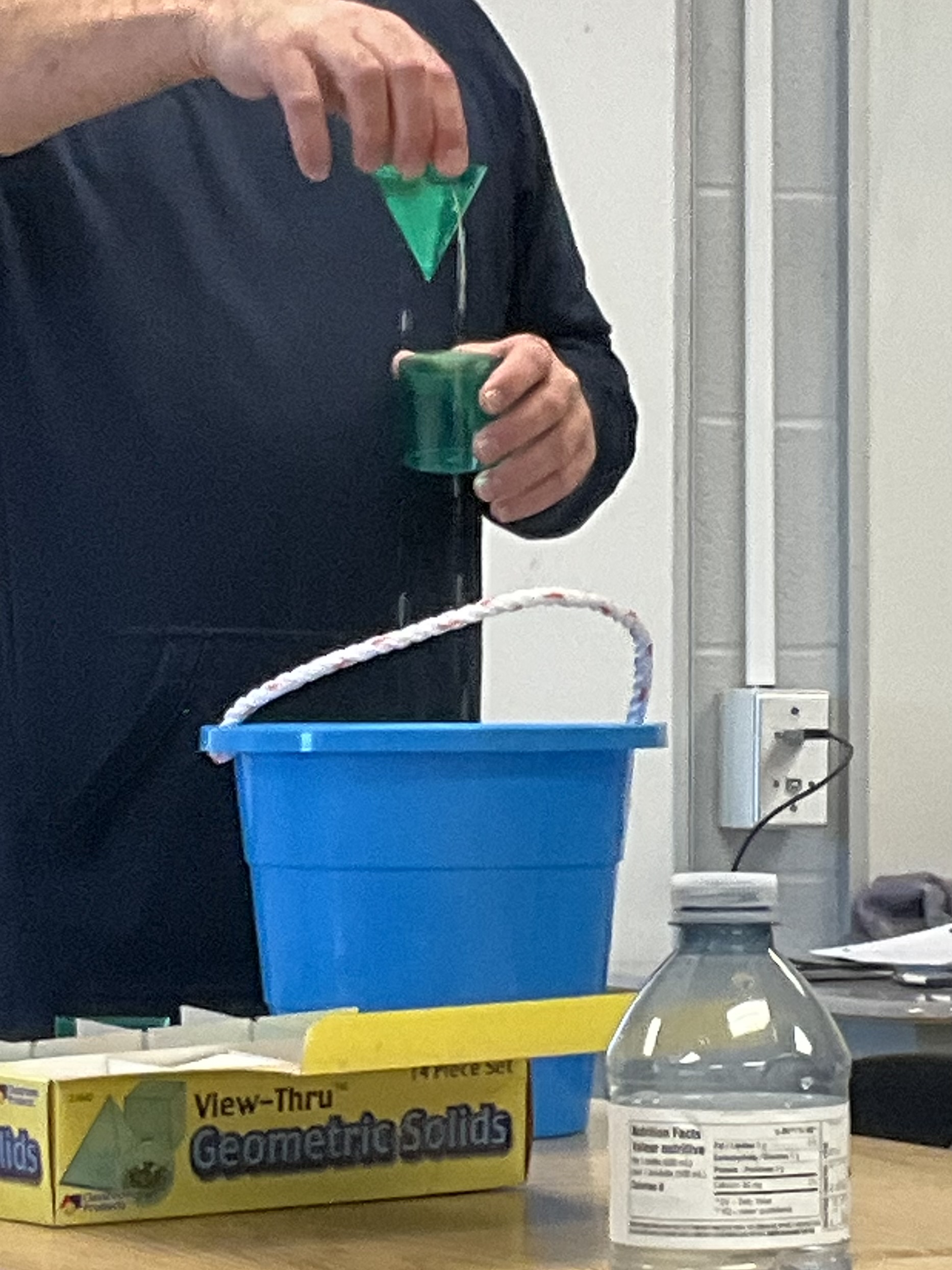 In the end, students saw that it took exactly 3 pyramids to fill a prism with the same base and height. (Note: if you are doing this activity be very careful not to overfill the pyramids since a meniscus would affect the volume).