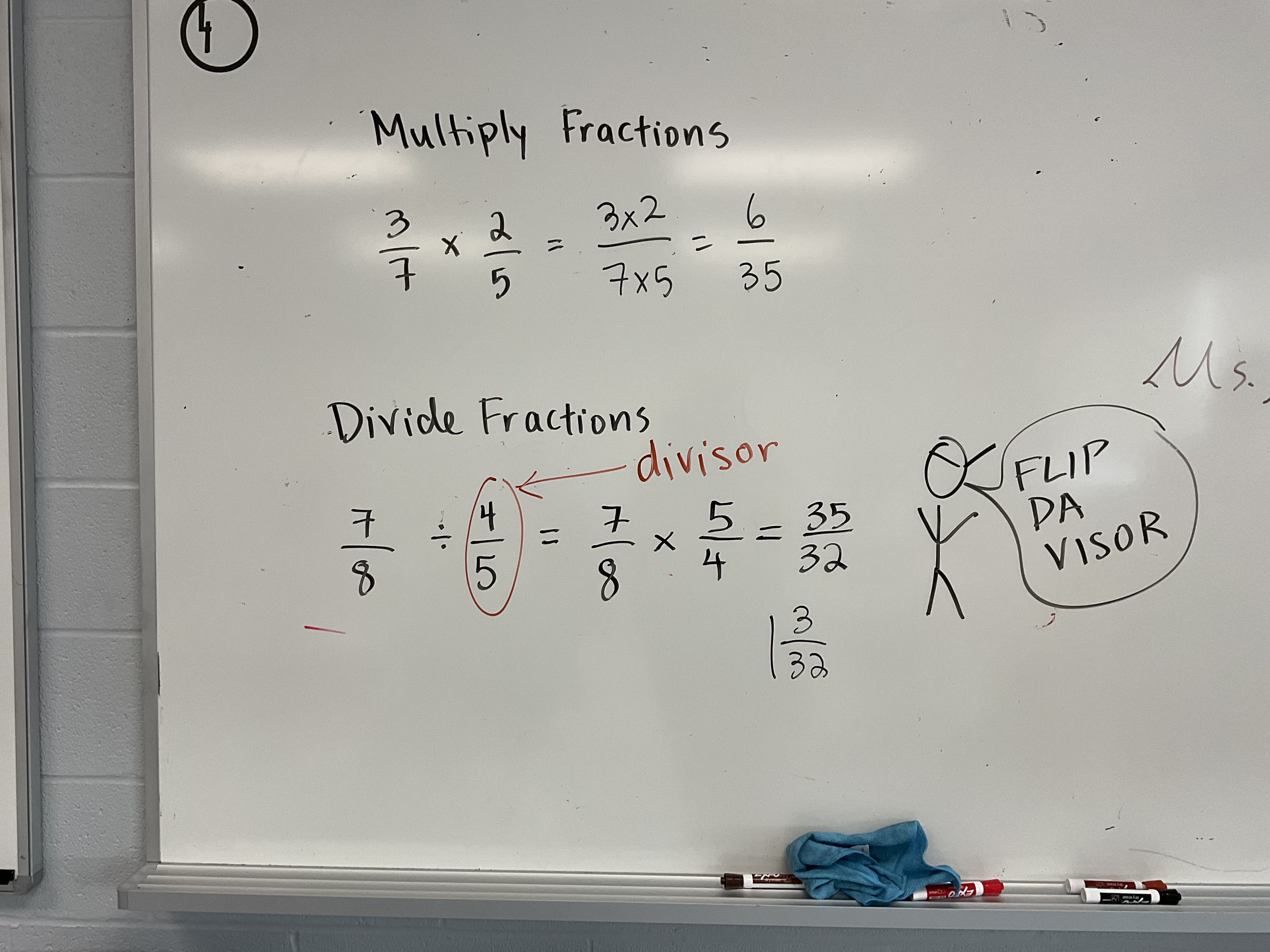 A trick I use to help with dividing fractions is to wear a visor upside down in class. Students wonder why I have flipped my visor. I link that to flipping the divisor (“flip da visor”) when we have a fraction division question. We flip the second fraction (the divisor) then multiply.