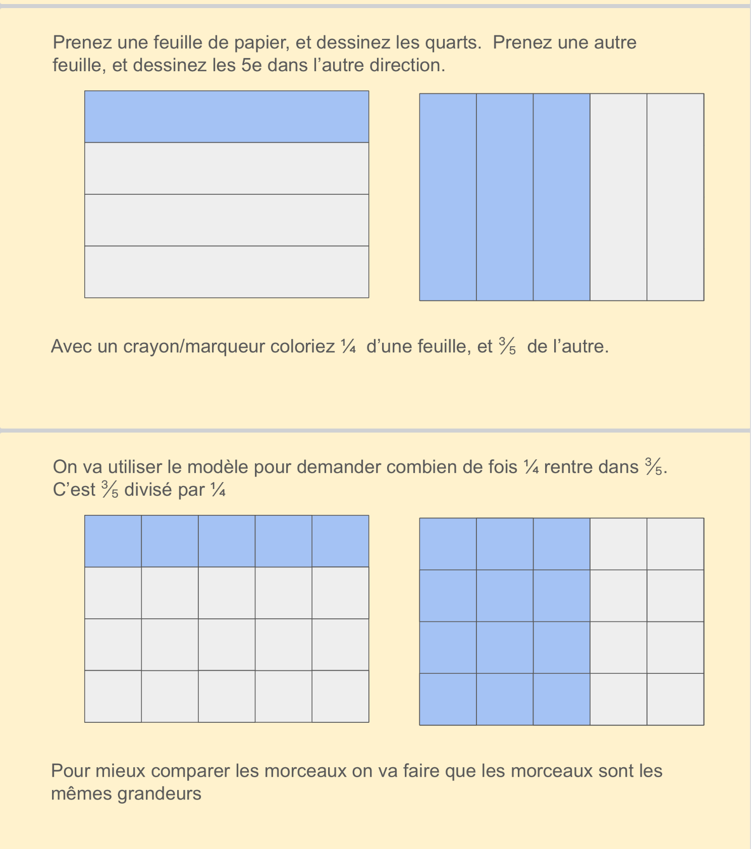 Dividing can be done visually as well. We make 2 rectangles, each representing one whole. We divide one horizontally into quarters and colour in 1/4, next we divide the other into 5ths vertically and colour in 3/5.
