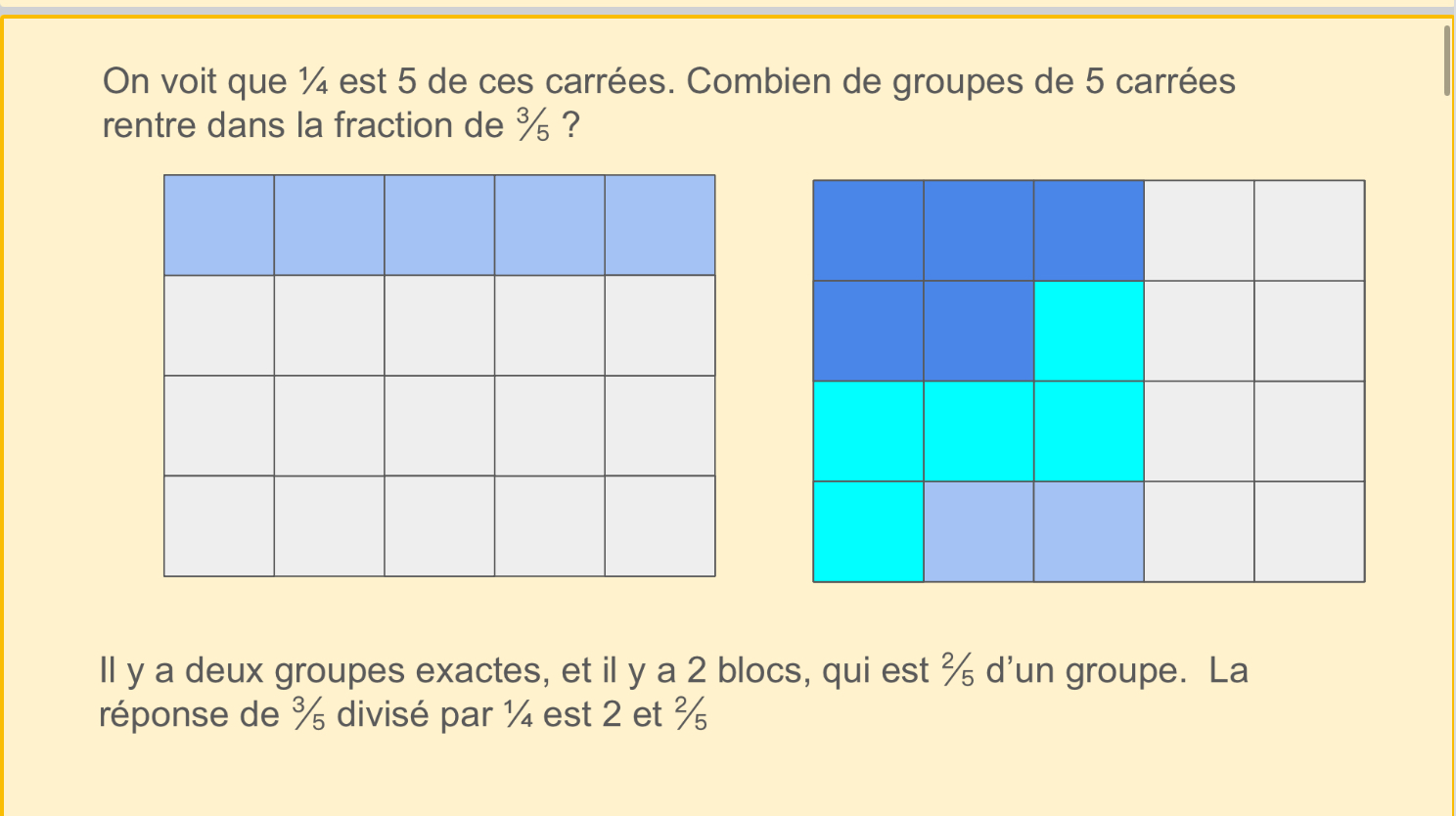 we will determine how many times 1/4 goes into 3/5, which is the same as asking 3/5 divided by 1/4. To figure this out, we make the pieces the same size, then count out 5 pieces in 1/4. We now look for how many groups of 5 pieces are in 3/5. I’ve coloured them in differently. There are 2 groups, and then 2/5 left. The answer is 2 and 2/5.