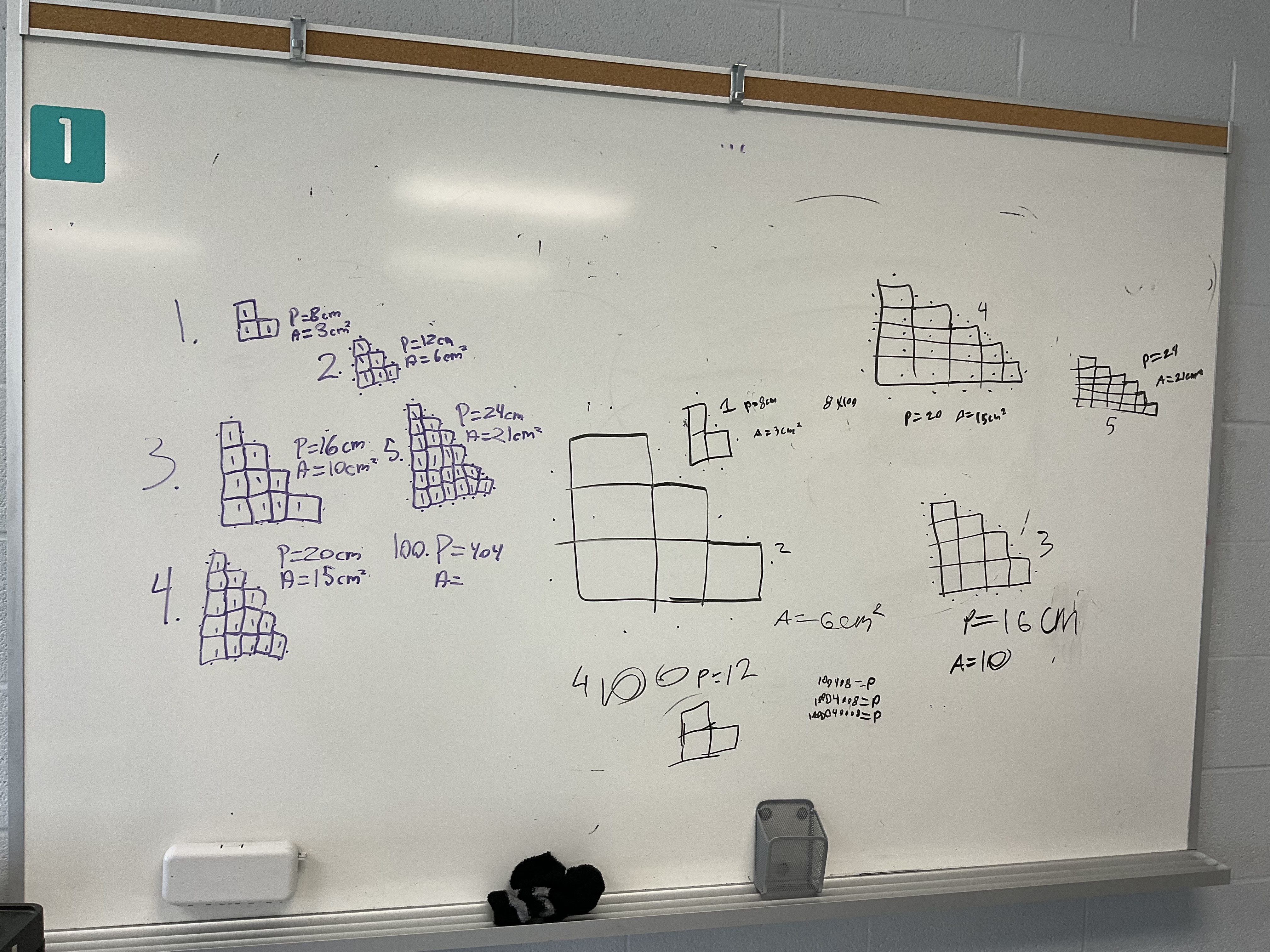 After this, while we were at the boards, we explored the perimeter and area of the figures in this pattern.
